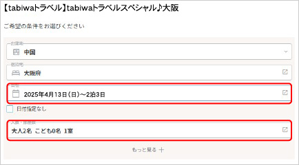 - STEP3「プラス1TRIP」はSTEP2「大阪旅行」のお申込みが必須となります。「プラス1TRIP」のみの予約はできません。