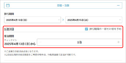 (注2)4/26・27・29、5/3~6、8/9~11出発の設定はありません。 - 予約完了後の旅行期間(日数)の変更はできません。旅行期間(日数)を計画いただき、STEP2・STEP3にお進みください。