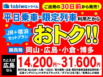 - 「大阪からのプラス1TRIP」、「ありがとうパンダ~南紀白浜の旅~1泊2日」、JR片道利用プラン(tabiwa得など)、tabiwa周遊パスやデジタルチケットは対象外となります。