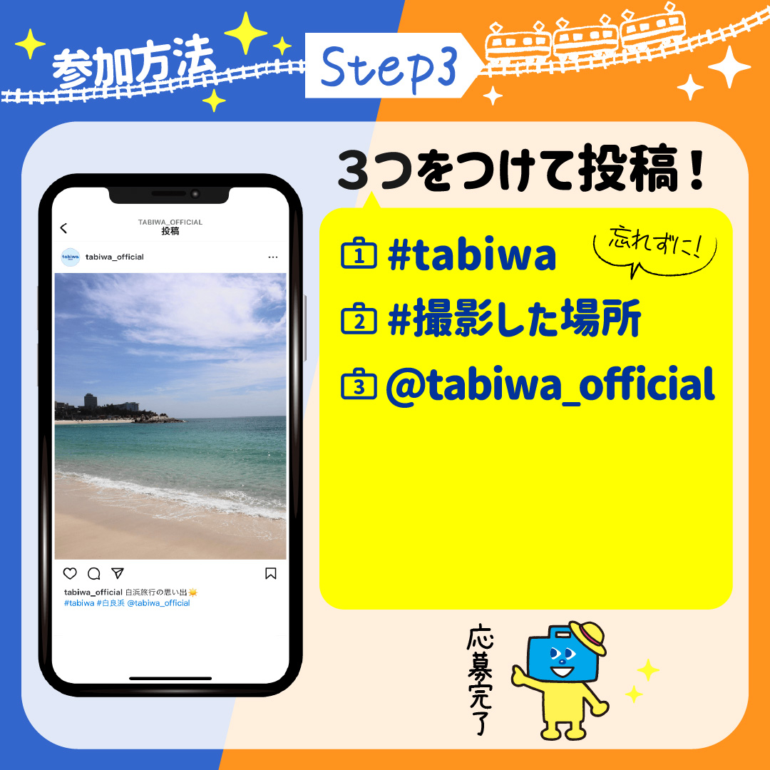 - 投稿本文内にハッシュタグ「#tabiwa」と「#(撮影した場所)」、メンション「@tabiwa_official」の記載がない投稿は無効です。