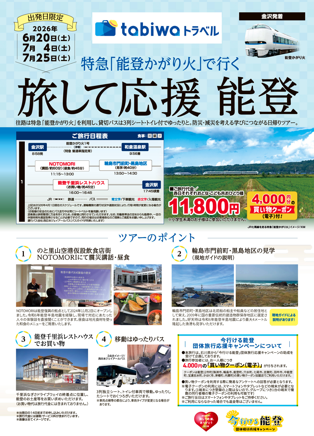 - 本旅行は、石川県から「今行ける能登」団体応援キャンペーンの助成を受けて企画しております。