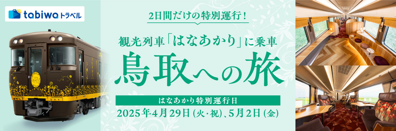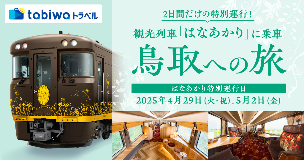 「はなあかり」がゴールデンウィークに大阪~鳥取間を特別運行します。観光、温泉、食など魅力あふれる鳥取へ。大阪・関西万博に合わせたプラスワントリップでのおでかけに、ゆったりとした贅沢な旅をお楽しみください。- ※参加資格は大人(中学生以上)の方のみとなります。