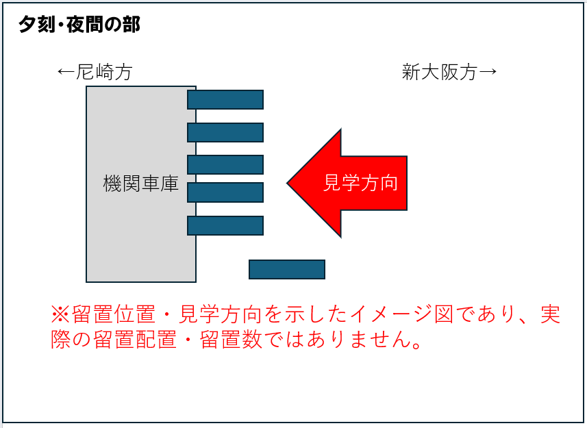 各地・・・集合までフリータイム・・・網干総合車両所 宮原支所 正門集合(19:30)・・・網干総合車両所 宮原支所 車両展示会(約90分)・・・終了後解散(21:20)・・・各地へ食事 朝:× 昼:× 夕:×