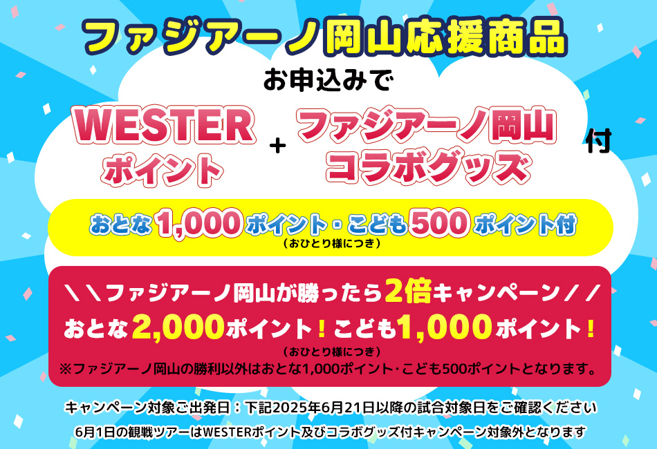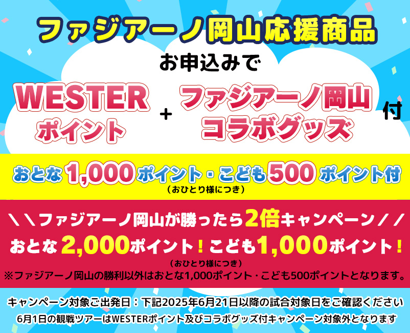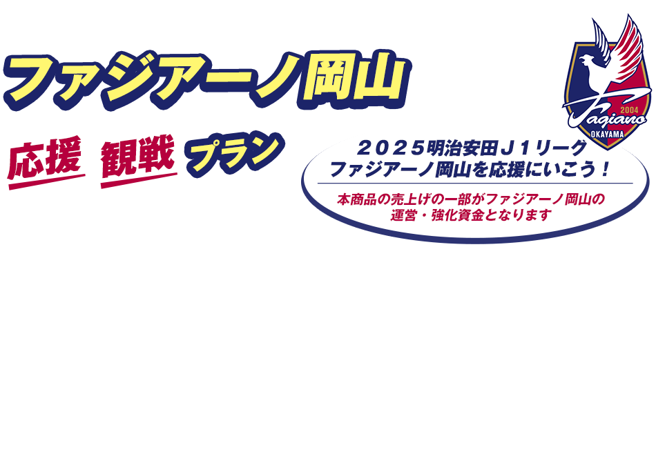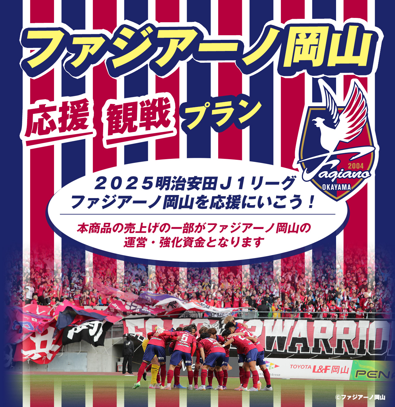 - 当ページ以外の【ファジアーノ岡山応援】旅行商品はキャンペーン対象外です。上記のSTEP2の【対象プランはこちら】または、下記のWEB専用プラン【JR+宿泊セットプラン・日帰りプラン】からお申込みください。試合開催地により設定プランは異なります。