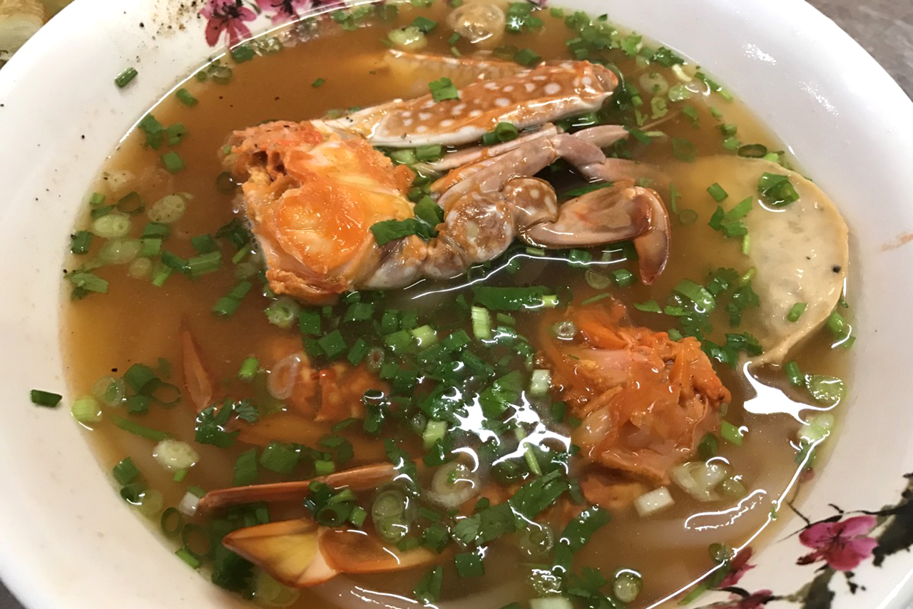主な味というのが蟹なんですね。ベトナムの南部は海鮮料理がものすごく豊富なので・・・バインカンっていうのはタピオカの麺を主に使っているので、プルプルのものなんですけど、蟹の出汁がたっぷり入っていて、蟹肉もけっこう入ってるんです。主に海鮮の麺になります。