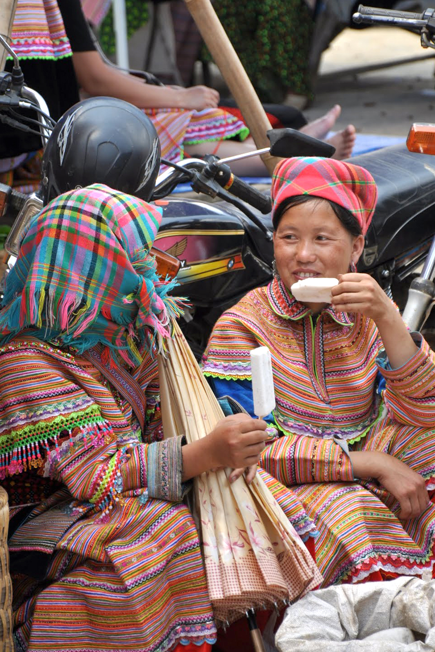 で、これはサパも一緒なんですけど、なんで今回私がバックハーにしたのかっていうと、バックハーに集まる少数民族というのが「花モン族」といって、非常に少数民族のなかでも衣装が派手なというか、で、私写真持ってきたんですけど、こんなイメージで、ピンクとか青とかをふんだんに使っている少数民族なので、こういう方達が一斉に山から降りてきて、あくまでも商売じゃなくて、自分達の日用品を買いに降りてくるので、それを目当てに外国人達が見に来てっていうところから始まってるんですね。