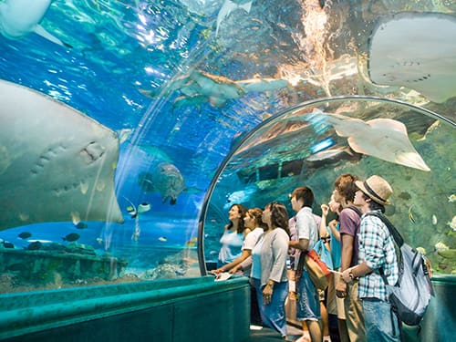 全長100メートルの世界一長いトンネル型水槽のあるグアム唯一の水族館です。水槽でサメと一緒にダイビングや餌付けもでき、併設のレストランでは水槽のお魚を見ながらのお食事も楽しめます。