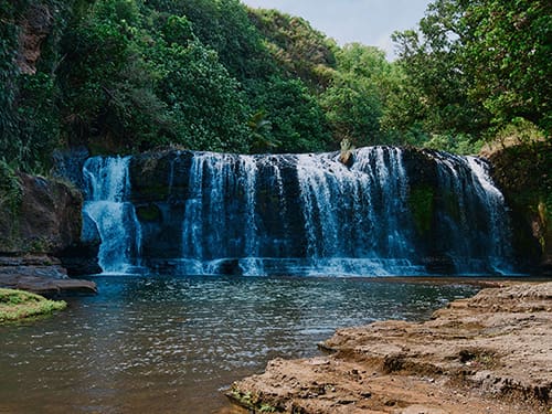 高さ9メートル、幅20メートルとダイナミックで見ごたえ抜群な島内最大級の三段の滝。間近で見るために乗るケーブルカーから絶景が楽しめるのも魅力的です。