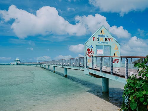 ピティ湾海洋保護区にかかる桟橋のゲートは、海洋生物のパラダイスの入り口です。潮風に吹かれて桟橋を歩きながら時々立ち止って海中を覗くと、白い砂の上には青ヒトデ、サンゴの間には現代アートのような模様をしたムラサメモンガラが泳いでいます。エメラルドグリーンからコーラルブルーまで刻々と色が移り変わるサンゴ礁特有の海の色も感動的。誰でも濡れることなく、神秘的な水深10Mの海底の楽園を訪れることが出来ます。