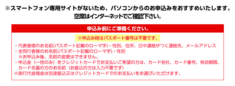 - ・1回の入力でお申込みいただけるのは、同じお申込み内容(日程・発着地・コース・ホテルクラス)ご希望の5名様までです。