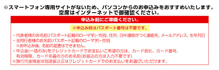 尚、ご旅行代金残金も全てクレジットカードでのお支払いのみとなります。(※振込み不可)