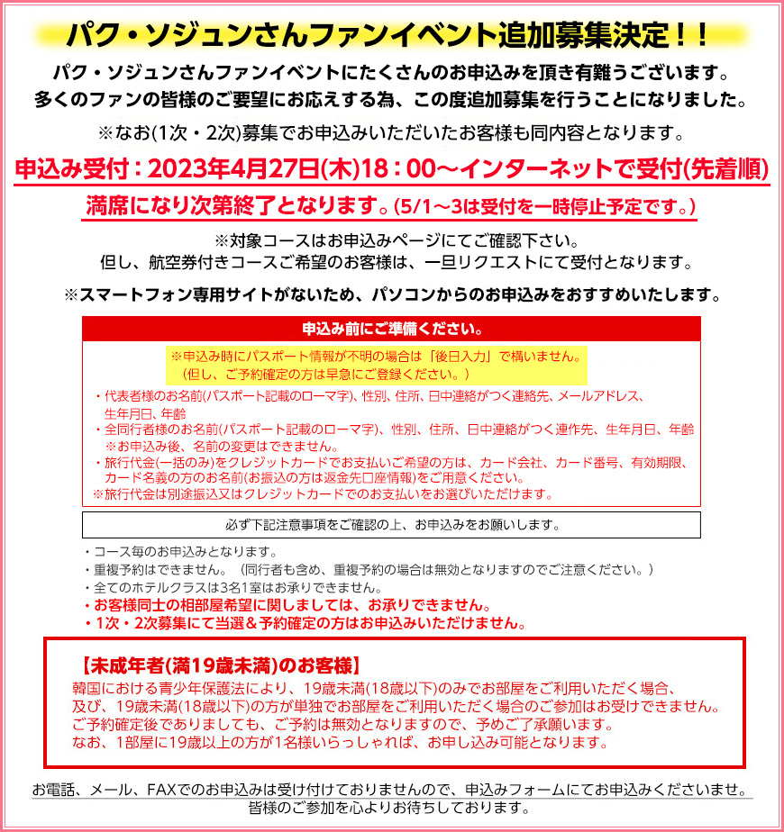 パク・ソジュンさんファンイベントにたくさんのお申込みを頂き有難うございます。