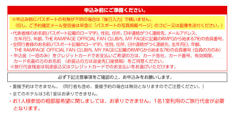 (THE RAMPAGE OFFICIAL FAN CLUB内、MY PAGEに記載のRMPGから始まる7桁の会員番号が未入力及び内容に誤りがあり会員情報が一致しない場合は、お申込み完了後でも無効(取消)となります。)