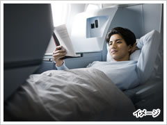 シンプルなデザインと優れた機能が充実の「ライ フラットシート」を導入。160cmものシートピッチにより、ゆとりあるプライベートスペースを確保しています。機内でお仕事をされる方のために、パソコン用電源を各席に、また、iPodなどのミュージックプレイヤー用のUSB電源もご用意。また、ノートパソコンも収納できる大型シートポケットもございます。
