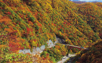 岩手県遠野市と釜石市の境にある緑深き峠。特に、紅葉の見頃の10月下旬〜11月上旬は訪れる人が多く、朱塗りの仙人大橋からの約6kmは、県内でも有数の紅葉名所として人気です。