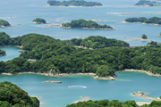 西海国立公園九十九島。佐世保港から北へ25kmにわたる海域に、大小208の島々が浮かんでいます。青い海と緑の島々のコントラストが美しい景観です。