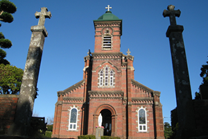 信者たちが自ら切り出した砂岩を積み上げて造った、珍しい石造りの教会です。教会建築の第一人者であった鉄川与助の設計・施工のもと1910(明治43)年に着工。完成まで9年の歳月を要しました。重厚な外観に対し、内部は優しい色彩で花の装飾などが施されています。