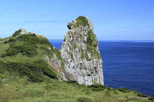 黒崎半島の先端にある高さ45mの海蝕崖の玄武岩。その姿がそっぽを向いた猿の姿にそっくりといわれて猿岩と呼ばれるようになりました。