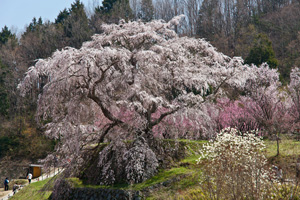 大阪夏の陣で活躍した戦国武将・後藤又兵衛が、豊臣家の再興の願いながらこの地で余生を送り、その屋敷跡とされる地にある桜の銘木です。日本一のしだれ桜と呼ばれる木は樹齢約300年。その見事な立ち姿はかつての豊臣の権勢を思わせます。