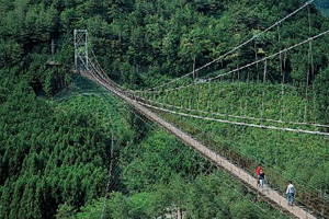 山峡に点在する集落を結ぶため、十津川に掛けられた日本最長の生活用吊橋。長さ297m、水面からの高さ54mの橋は周辺に高い建物が無いこともあり、なかなかスリル満点。また、橋の上から眺める深い山々と清澄な十津川はまさに絶景です。