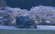 蘇我馬子の墓との伝説も在る奈良を象徴する古墳「石舞台」。春には巨大な石室を雅な桜が彩ります。開花期間中は桜をライトアップ。見事な夜桜を堪能できます。