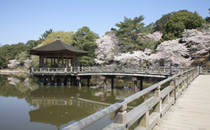 奈良公園にある浮御堂周辺は奈良中心部でも有数の桜の名所。毎年3月下旬より咲き始め、近隣より観光客が訪れます。開花の時期にはライトアップされ、水面に映る幻想的な夜桜を楽しむことができます。