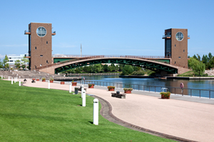 富岩運河を囲むように広がる水辺の公園です。芝生が広がる開放的な公園では、子どもからお年寄りまで誰もが心地よいひとときを過ごすことができます。園内は展望台を持つ公園のシンボル・天門橋をはじめ、泉と滝の広場、大型遊具などのほか、富岩水上ラインでの運河クルーズも楽しめます。