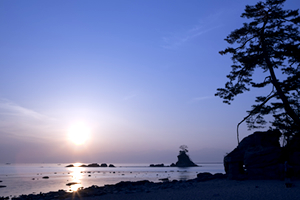 浜から眺める岩礁、富山湾越しに見る3,000m級の立山連峰の雄大な眺めは、四季それぞれに変化し、息を呑む美しさです。雨晴海岸から氷見市の松田江の長浜までは「白砂青松百選」・「日本の渚百選」に選ばれています。