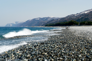 東西約4kmに連なる砂利の美しい海岸です。夏には若者や家族連れの海水浴客で溢れかえります。ヒスイの原石が打ち上げられることから「ヒスイ海岸」とも呼ばれ、波の荒い日の翌日にはヒスイ探しを楽しむ人々も。