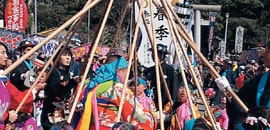 - 「春一番、鹿島立ち」祭頭祭。毎年3月に「イヤートホヨトホヤァー」の歌に合わせて、色鮮やかな衣装を身にまとった囃人が約六尺の樫棒を組んでは解き、街中を練り歩く勇壮な祭り。昭和51年に国選択無形民俗文化財の指定されました。