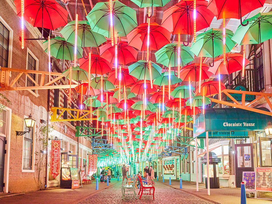 約700本の傘が頭上を彩るアンブレラストリートは、季節ごとに色やデザインが変わり、何度でも訪れたくなる映えスポット。音楽に合わせて煌めくイルミネーションショーも必見です。