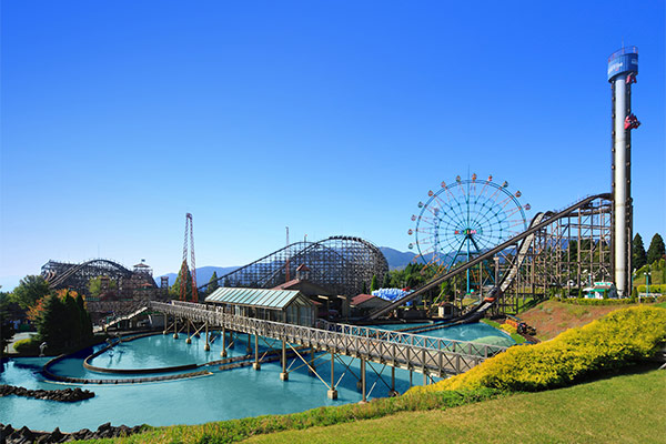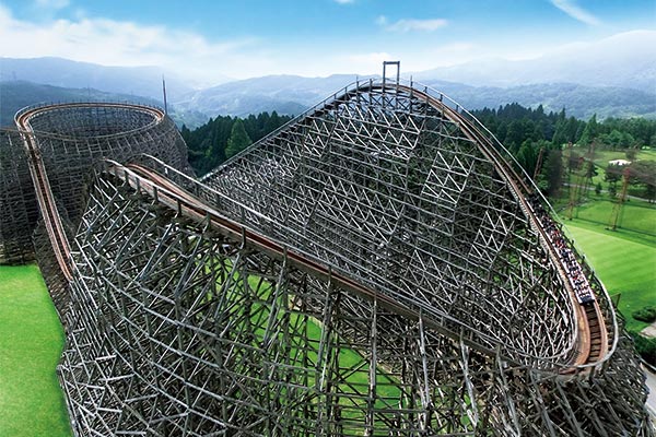 阿蘇くじゅう国立公園の由布岳・鶴見岳の麓に広がる遊園地。日本初の木製コースター「ジュピター」をはじめ、アトラクションは約40種類。