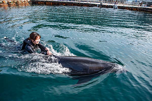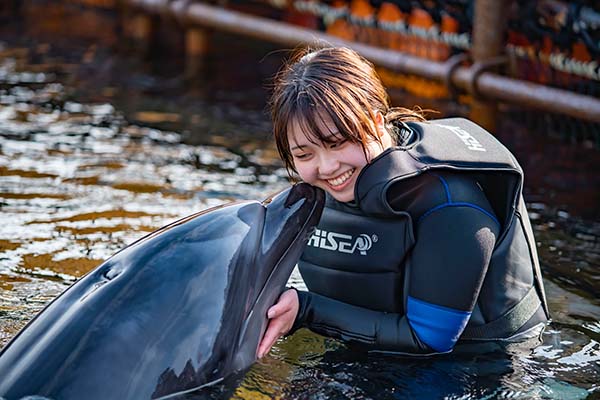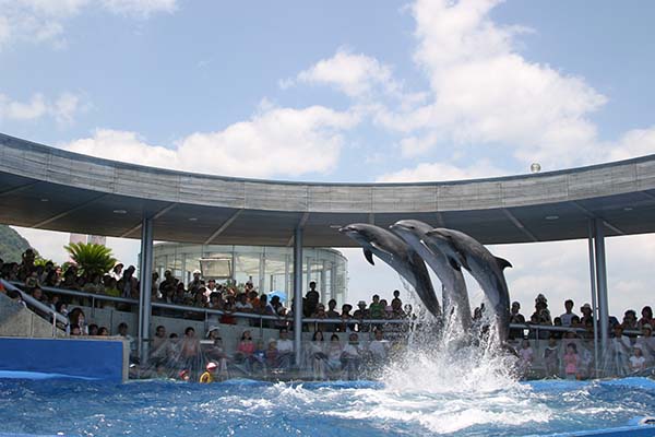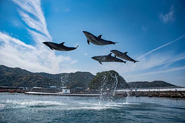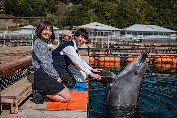 うみたま体験パーク「つくみイルカ島」は、美しい海を利用したダイナミックなイルカパフォーマンスをはじめ、イルカボートからのイルカの餌やりやアザラシやペンギンなど動物たちとのふれあいを体験できる参加体験型レジャー施設です。