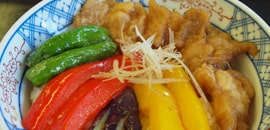 - 生産量全国1位を誇るショウガ、シシトウ、ナスなどの彩りが、よさこい祭りで踊り子が手に持つ鳴子をイメージさせる「なるこ丼」。高知が誇る食材を使って高知を元気にしようとする取り組み「高知B級グルメ維新!!」から生まれました。