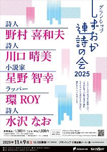 - 5人の言葉の表現者が、静岡の地で三日間に渡り40編の現代詩を創作。できたばかりの作品を、作者自らの朗読・解説で披露する。ステージで明かされる創作時のエピソードにも注目しよう。出演は野村喜和夫(詩人)、川口晴美(詩人)、星野智幸(小説家)、環ROY(ラッパー)、水沢なお(詩人)静岡県出身。