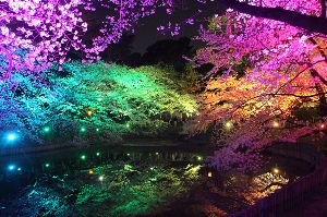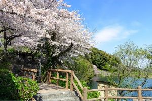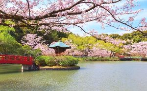 - 六角堂を配した「正伝池」と桜の美しい景観