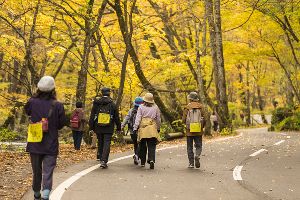 - 神秘的なカルデラ湖を取り囲む神々しい紅葉