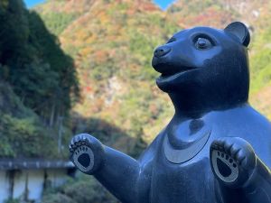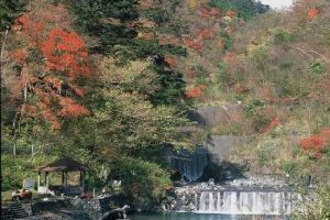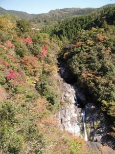 - ダイナミックな滝が鮮やかな紅葉に包まれる