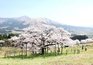 - 阿蘇の山々を背景に咲く美しい一本桜