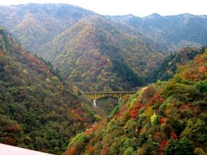 - 渓谷と錦に染まる山々のコントラストは必見