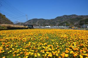 - 広大な田んぼに色とりどりの花が咲き誇る