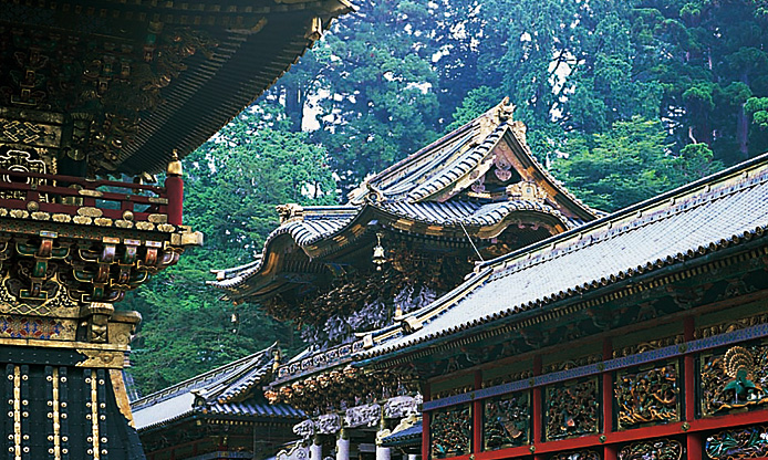 奈良時代から山岳信仰の霊場と崇められていた日光山。徳川家康を東照大権現として祀り、天皇から輪王寺の称号が許されて神仏習合の聖地が誕生しました。創建当初は質素だった社殿は家光によって建て替えられ、自然の中に溶け込んだ絢爛たる人工美が出現。中でも陽明門は、燦然と輝く金箔や金具、500を超える極彩色の彫刻に埋め尽くされた技の極致で、眠り猫などの彫刻には思想や願いが込められています。1999年に、日光山内にある2社1寺の103棟の建造物群と自然環境が一体となった文化的景観が、世界文化遺産として登録されました。