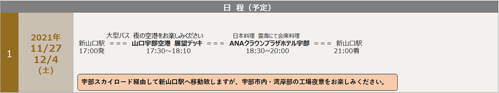 2016年に開港50周年を迎えた山口県宇部市の空の玄関口は利用者の利便性、快適性、ユニバーサルデザインを取り入れた建物として多くの方に利用されています。日中の空港内展望デッキは、家族連れで飛行機の離着陸を楽しむ光景をよく目に致しますが、今回のツアーは夜景の中で飛行機の離着陸を見ることができるツアー内容となります。(コロナ感染状況により該当便欠航の場合は空港夜景をお楽しみいただきます)
