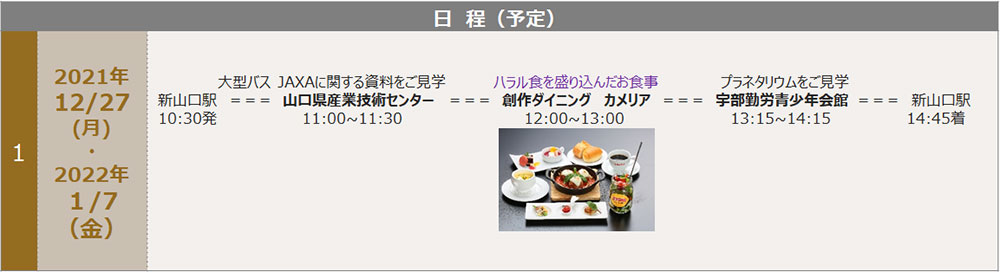 山口県産業技術センターは宇部市にある公設試験研究期間として様々な研究開発・技術相談等様々な支援を実施していますがその中でもJAXAに関する宇宙関連資料をご見学いただきます。また昼食では、国際ホテル宇部「創作ダイニング カメリア」にてハラル食などを盛り込んだお料理をご提供致します。その後は、宇部勤労青少年会館は幅広い年齢層に利用いただいておりますが、もっとも人気の高いプラネタリウムの見学を行います。