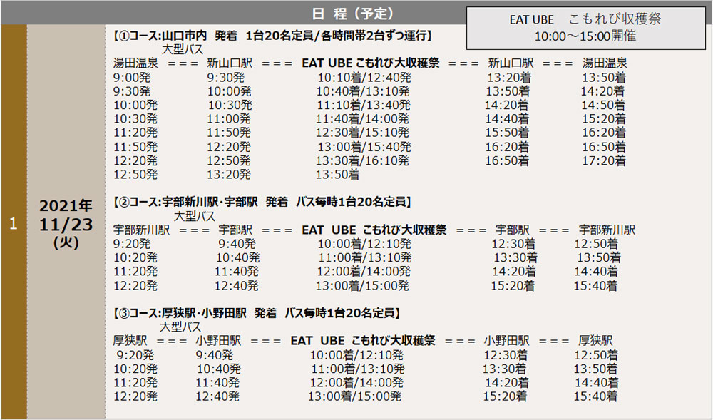 毎年好評の楠こもれびの収穫祭に、県内の魅力が大集合。宇部市内の飲食店が提供する「宇部のおいしいもの」が盛りだくさんのイベントへモニターバスを運行いたします。普段車の運転がメインの方も気軽に参加していただき、お酒やグルメを楽しめる内容となります。