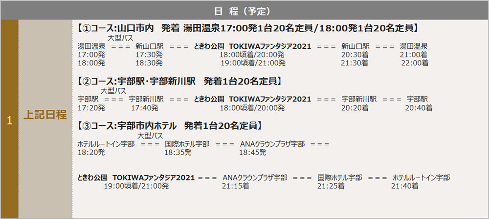 ※新型コロナ感染症拡大対策として、乗車定員を1台20名様と設定させていただいております。お申込み状況によっては、デジタルチケット(無料)をご購入いただいていた場合でも、定員(20名)を越えた場合は、バスにご乗車いただけない可能性がございますので予めご了承下さい。