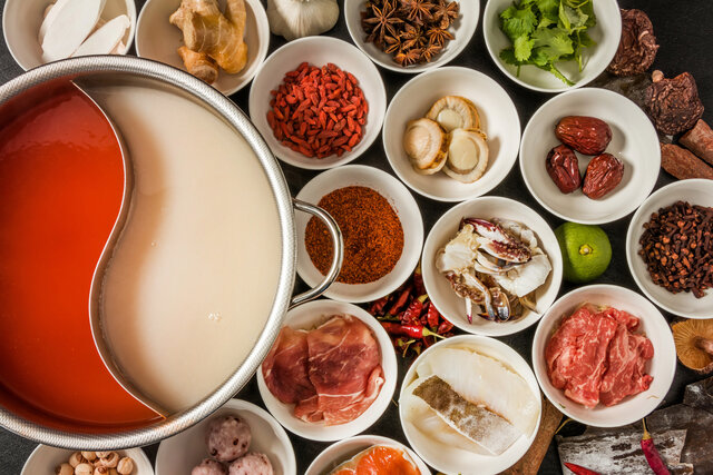 仕切りのあるおしどり鍋を使用し、一つの鍋で辛いスープとまろやかなスープの2種類の味を楽しめるのが魅力。