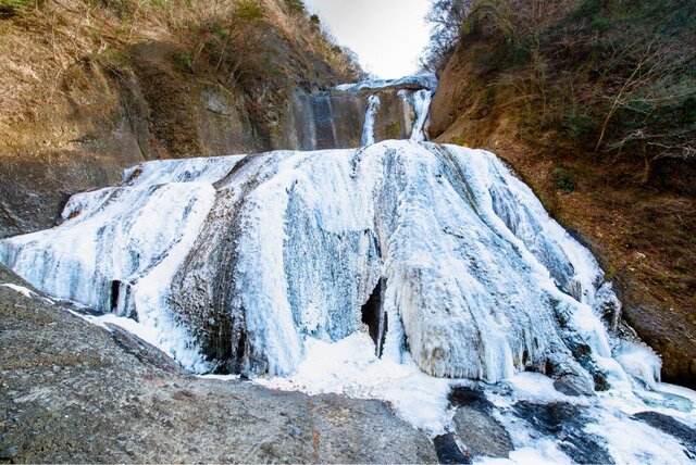 袋田の滝は、日本三名瀑のひとつに数えられる名所。4段に流れる独特な形状から「四度の滝」とも呼ばれ、冬になるとその流れが白く凍結して巨大な氷の壁が出現します。