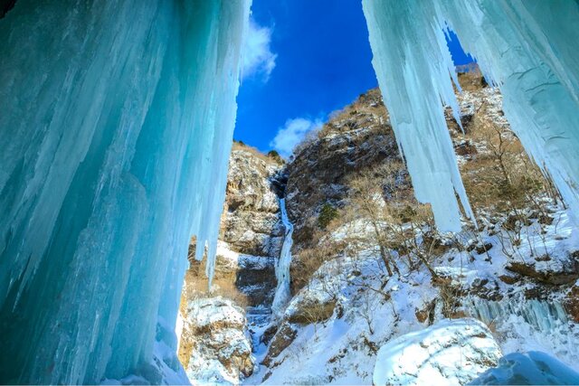 雲竜渓谷は、日光の冬における隠れた絶景スポット。幅100mにも及ぶ岩壁に無数の巨大なつららが並ぶ光景は、別名「氷の神殿」とも呼ばれています。