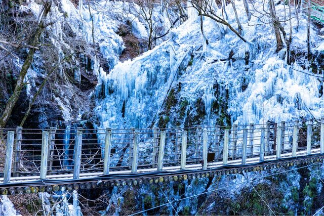 尾ノ内百景氷柱は、秩父連山の沢水を地元の人々が丁寧に散水して作り上げた氷の芸術。最大の特徴は、氷柱を眼下に望む吊り橋からの眺めです。